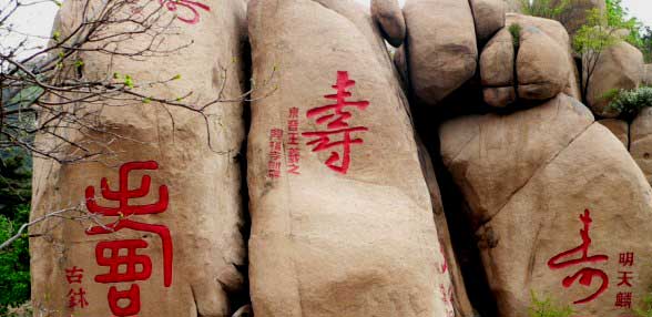 從山名可以看出,此地的風(fēng)景與“壽”有關(guān),的確,景區(qū)內(nèi)都以雕刻、建筑、書法等多種形式反映出長壽延年的主題,尤其是景區(qū)中部壽山上的壽字碑林,大大小小形態(tài)各異的石塊上刻著歷代書法家所寫的“壽”字,字體不同,風(fēng)格迥異,其中不乏書法大家的珍品,如王羲之、顏真卿、歐陽詢、米芾、蘇東坡等都在這里留下了墨寶,這一處碑林也就成了書法愛好者向往之地。置身其中,既可受到民族文化藝術(shù)的熏陶,還可領(lǐng)略獨(dú)特的山情水趣。