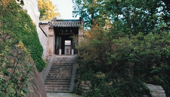 太平宮初名太平興國院,又稱上苑。系宋太祖為華蓋真人劉若拙敕建道場,金明昌年間(公元1190~1195年)重修。正殿名三清殿,配殿為三官殿和真武殿,坐落在嶗山東部上苑山北麓、仰口灣畔。 宮西絕壁矗立,下有天然石洞。洞內(nèi)縱橫各數(shù)丈,高敞如廈;洞頂鐫刻“混元石”三字及星斗圖案;洞旁眠龍石上,鐫“猶龍洞”三字。宮北山坡下有澗水噴涌,相傳曾有農(nóng)人見白龍游泳其中,名白龍澗。澗底巨石累累,橫跨兩岸,水從石隙下瀉,稱仙人橋。過橋山坡有巨石,上刻邱處機(jī)詠嶗山七絕20首及序。 宮東北奇峰突起,形同巨獅,張嘴作怒吼狀,名獅子峰。峰巔崗巒平敞,云氣彌漫,有“獅嶺橫云”勝景。
