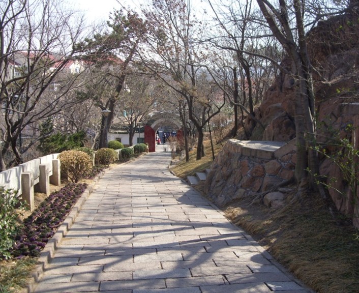 我們從小魚山的大門抬階而上,看到的這個(gè)亭子是一個(gè)挑檐式的六角亭,在亭內(nèi)可以把碧波蕩漾的匯泉灣一覽無余,故得名“碧波亭”。“碧波亭”的匾額“碧波”二字是由著名的國畫藝術(shù)大師吳作人手書的。大家看遠(yuǎn)處的山上有三棟紅色蘑菇樓宛如三柄熊熊燃燒的火炬,那是青島市十大山頭公園之一的信號山公園。在半山腰綠樹叢中的那棟別具特色的建筑是青島市迎賓館,原是“德國總督府官邸”。我們再由“碧波亭”拾階而上,站護(hù)欄邊可以看到右下邊有兩幢民族式建筑,一座形如城樓,一座貌似宮殿,那就是青島市海產(chǎn)博物館。