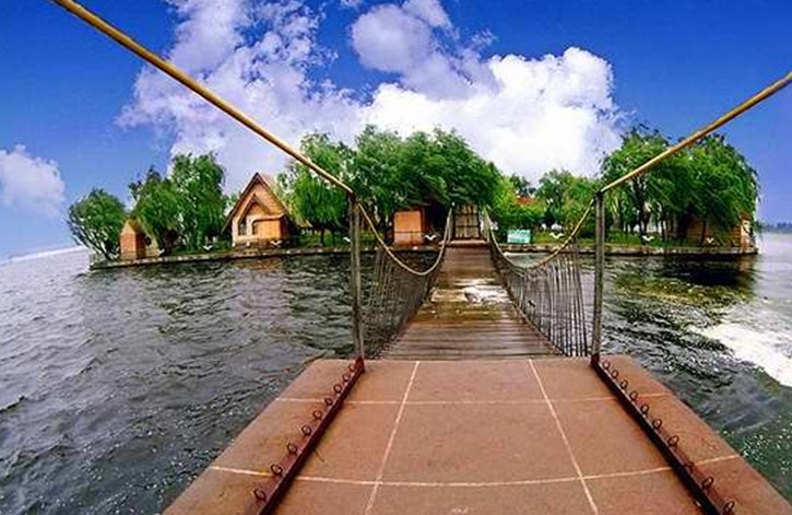 生態(tài)濕地:占地4000畝,全長3800米,是在保留原有植物的基礎上結合閘壩下的灣塘,地形稍做調(diào)整,配置水杉、竹、柳、荷、蒲、葦?shù)认菜参铮纬傻拇竺娣e良好自然生態(tài)濕地,為天鵝、白鷺、翠鳥、野鴨等鳥禽、蟲魚的樂園。并建有觀光碼頭,配以竹筏、木船,舟筏穿行、碧波蕩漾,改善了生態(tài)環(huán)境,又能供游客游覽觀光。岸邊設淡水魚養(yǎng)殖場、水禽園等項目,配以當?shù)靥厣娘L味小吃,游客在游覽觀光的同時可以體驗漁家生活。