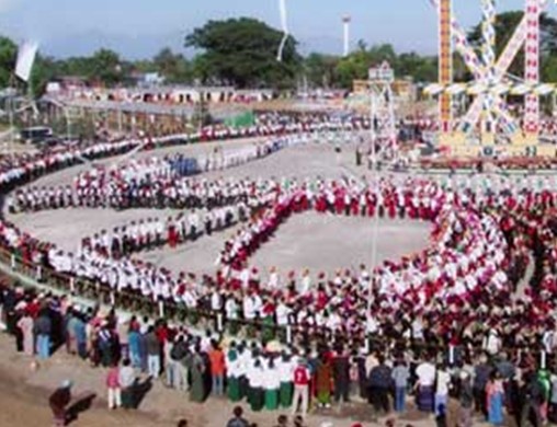 1958年,在密支那修建了永久性的目瑙祭壇,嗣后每年都在這里舉行全邦性的目瑙會(huì)。目瑙埸建在江邊,埸地寬闊,設(shè)有西門和北門。兩門頗有民族特色,是一個(gè)模子倒出來(lái)的。門枋是一對(duì)象牙抬著一扇铓,兩側(cè)是四根交叉的雌雄目瑙柱,門衛(wèi)是兩位手持長(zhǎng)刀和梭鏢的克欽先民武士。目瑙祭壇與德宏的大同小異,德宏的是四根直立的雌雄柱,中間是兩把雌雄刀;密支那的是十根交叉的雌雄柱,中間有一根橫桿固定其交叉部位。其共同點(diǎn)是基座均為犀鳥,雌柱上繪的蕨葉藤和雄柱上的三角圖案相似,中間兩根雌雄柱頂端各繪著月亮和太陽(yáng),南側(cè)建有祭鬼崗樓。目瑙柱北邊矗立著一座龐大的目瑙房,這是一所典型的克欽族現(xiàn)代建筑,不僅氣派豪華,而且極富民族特色。尤其是陽(yáng)臺(tái)上的7根粗實(shí)巨大的中柱,繪滿了豐富多彩的民族圖案,它象征著克欽族由7個(gè)支系組成,在牛頭文化精神的引領(lǐng)下,克欽族將獲得新生。