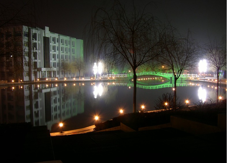 燕鳴湖——身份與精神的延展。燕大之美,在夫燕園一景,燕園之美,存諸燕鳴一湖。“燕”是歡樂的意思,宴會的“宴”在古代和這個字是通用的。它們似乎讓學(xué)校更多了些靈性。湖水倒映著一座“摩天大廈”,光亮的樓身在海風(fēng)中散發(fā)出雄偉的魅力。一座石橋貫通湖面東西,橋下水壩把燕鳴湖分成南北兩個湖區(qū),把校園點綴得相當(dāng)漂亮。每當(dāng)?shù)谝豢|陽光灑向湖面,就看到眾多學(xué)子在湖邊晨讀;每當(dāng)夜晚降臨,燕鳴湖更是成了同學(xué)們小聚的天堂,空氣中洋溢著溫馨的氣息。