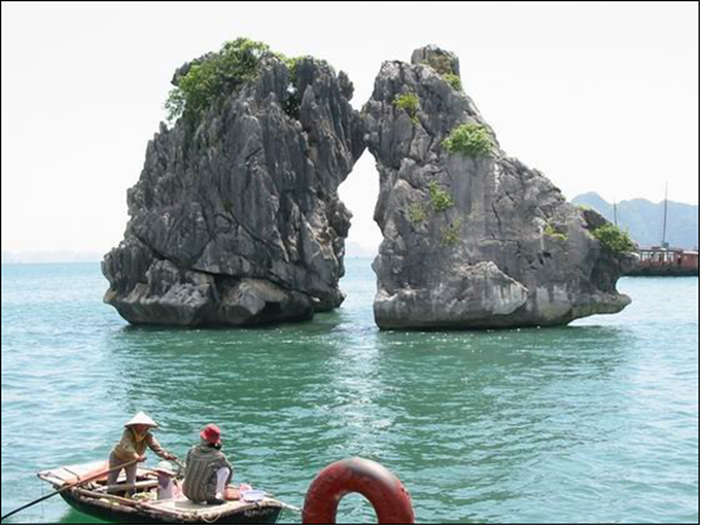 素有“海上桂林”之稱。這是游人乘小漁船在越南下龍灣著名的“斗雞石”前觀賞風景