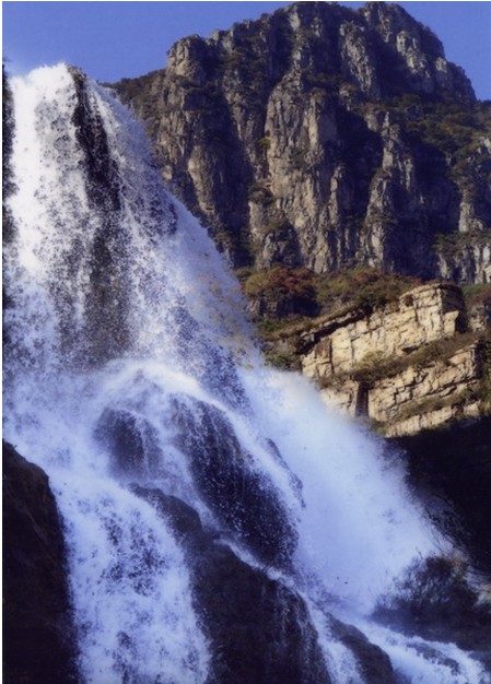 女妖洞口好似魚口,呈橢圓形,高20余米,寬10余米,距崖底20米。洞內(nèi)有地下暗河流淌,洞口常年往外流水,雨季洞水如柱,噴射而出,版權(quán)所有山東聊城聊之旅國(guó)際旅行社有限公司,轉(zhuǎn)載必究!從20米高的懸崖峭壁上跌下來(lái),落到20米外山坡上,濤聲如雷,氣勢(shì)壯觀。旱時(shí)水流如帶,沿著裸露的巖壁流下,匯入崖底深潭。水潭方圓400平方米。深不見底,高聳的懸崖峭壁倒映在水中,湖光山色,如入畫境。待到水位高漲,潭水漫過潭,順山勢(shì)直瀉山底,一路上隨著高低不等的落差,形成三道梯級(jí)瀑布,其中第一級(jí)瀑布寬5米、高10米,第二級(jí)瀑布寬7米、高20米,第三級(jí)瀑布寬3米、高30米,經(jīng)過三級(jí)瀑布,潭水最終匯入東流的郊溝河中。