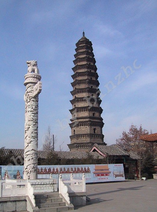 七寶塔在山西平順縣城西北23公里大云寺前。周顯德元年(公元 954年)建。通體用堅硬青石雕造。原為七層,現(xiàn)存五層,高為六米。下三層平面八角形。第一層雕寶裝蓮花、獅子、麒麟、飛馬等。第二層雕伎樂人,體態(tài)輕盈,舞姿優(yōu)美,伴奏者栩栩如生。第三層轉(zhuǎn)角處雕絞龍柱,回旋盤繞。塔檐下飛鳳、飛仙、共命鳥等變化多姿。