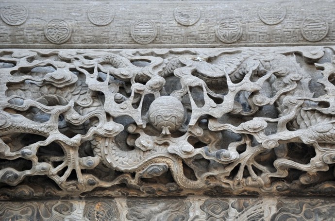 八根夾柱分八組雕刻百個(gè)石獅。大獅巨頭卷毛突目,隆鼻闊口利齒,巍然蹲踞,矯捷威猛。每個(gè)大獅身上攀伏著五個(gè)小獅,有的撓癢自?shī)剩械姆诖螵{的腿上,舔咂撫鈴。獅座前左右三面浮雕圓形松獅圖,幼獅三三兩兩,蹦跳翻滾,爭(zhēng)戲繡球。每根立柱透雕四條蛟龍,在柔美飄逸的祥 云間卷舒出沒,盤旋回舞。正間上下額枋、次間額枋及正檐下“圣旨”匾四周鏤空透雕二龍戲珠,雕龍懸目奮爪,搖頭擺尾,如騰似飛。正間中額枋上分三層鏤空透雕串枝牡丹,給人以五彩繽紛、香沁肺腑之感。牡丹間以變形的“卍”字形云紋,寓意“富貴萬(wàn)年”,樓檐下獸斗花拱,如意枋板承托。脊和檐角上雕配的吻獸、象尊、岔獸、魚、海馬、跑獸皆造型優(yōu)美,生動(dòng)傳神。吻尾外卷張口吞脊,每個(gè)吻獸身上又浮雕兩條游龍,生動(dòng)活潑,象馱寶瓶,憨態(tài)可掬。正脊中間雕塑二龍朝天,相托一珠瓶類飾物,像塔剎一樣高聳空中。其他部位也均浮雕、平雕有雙龍、牡丹、菊花、團(tuán)鶴、團(tuán)壽等吉祥圖,正間下枋板的孔鼻上還雕一懸掛石鳥籠,微風(fēng)吹來(lái),石鳥翩翩展翅,呤叮作鳴。整座牌坊結(jié)構(gòu)精巧,宏偉壯觀,雕刻精細(xì),玲瓏剔透,繁而不亂,主次分明,是全國(guó)罕見的典型清代石雕建筑。