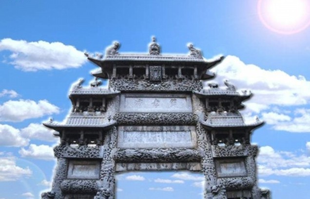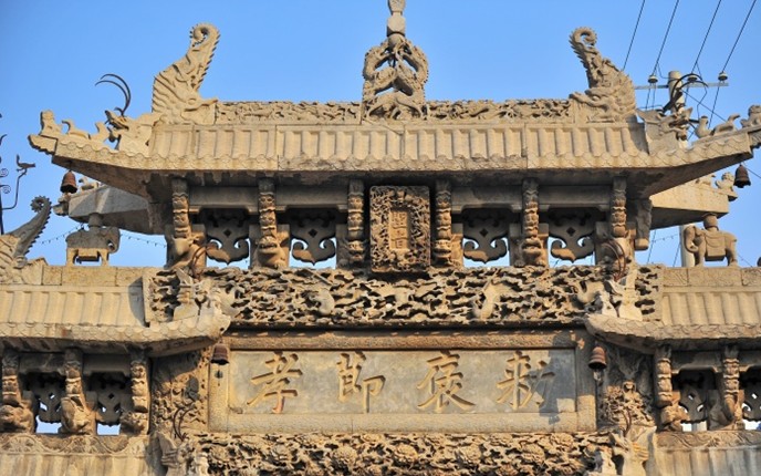 因雕有一百個不同書體的壽字而得名。坊以青色魚子狀石灰?guī)r構(gòu)成,通高l3米、寬8米,四柱三間三層樓閣式建筑。其獨特之處是:坊座雕有8頭矯健雄獅昂首遠望,8條出水蚊龍繞柱回舞,額枋上飾滿盛開牡丹,與正間上下額枋祥云間翩翩飛舞的5只透雕仙鶴、次間上額枋浮雕的相對翱翔之鸞鳳構(gòu)成了具有無窮魅力之藝術(shù)佳作,寓意福壽萬年、富貴無媲或喜上眉梢。