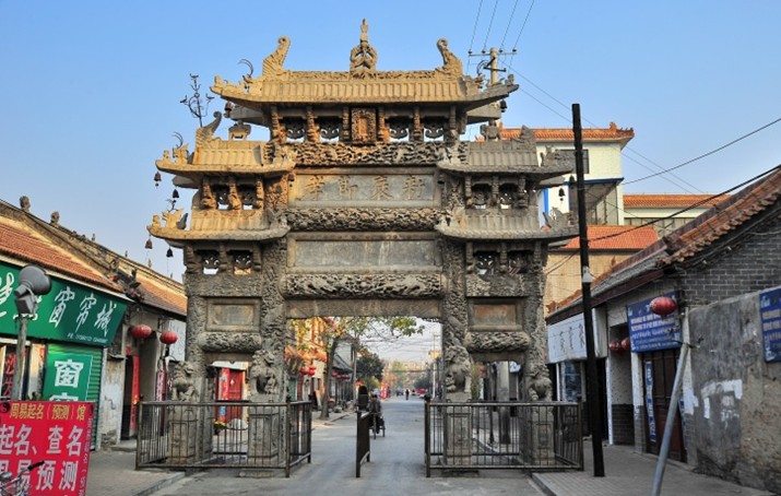 百壽坊俗稱朱家牌坊,位于單縣城內(nèi)勝利北街,乃清乾隆三十年(1765年)為翰林院孔目贈儒林郎朱叔琪妻孔氏而建,因雕有一百個不同書體的壽字而得名。坊以青色魚子狀石灰?guī)r構(gòu)成,通高l3米、寬8米,四柱三間三層樓閣式建筑。其獨特之處是:坊座雕有8頭矯健雄獅昂首遠望,8條出水蚊龍繞柱回舞,額枋上飾滿盛開牡丹,與正間上下額枋祥云間翩翩飛舞的5只透雕仙鶴、次間上額枋浮雕的相對翱翔之鸞鳳構(gòu)成了具有無窮魅力之藝術(shù)佳作,寓意福壽萬年、富貴無媲或喜上眉梢。