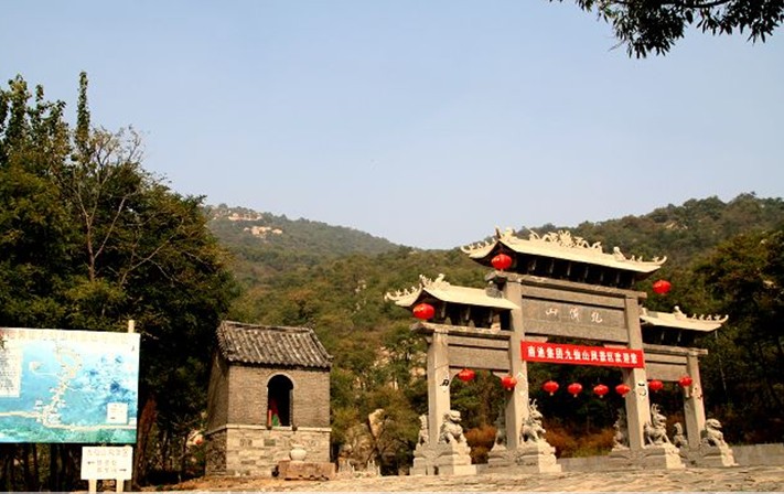 九仙山同泰山一樣,也有“一天門”、“中天門”和“南天門”。然而,一天門距中天門雖十幾米,但石階陡峭。須步步登高。也不是一件輕松的事。進入中天門,再拾級住上,方到達南天門。新修復的南天門座北朝南,矗立于一生片高峻的巨石之上,從下面仰視,好像置于蒼穹白云之間,氣勢凌厲,分外雄壯。