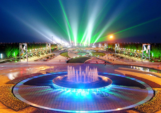 太陽廣場,占地9萬平米,最多可容納觀眾3萬人,中國水上運動會開幕式在這里舉行。廣場以“水”為創(chuàng)作元素,西部入口處是一個圓形噴泉;中間是一條蜿蜒曲折的溪流水景帶,溪流上建有幾座設(shè)計別致的小型景觀拱橋,溪流帶中間安放6組水上運動造型的鑄銅雕塑;廣場兩側(cè)各有兩組燈光廊架,白天是造型別致的雕塑,夜晚是絢麗多姿的燈光景觀。太陽廣場東側(cè)環(huán)抱水域中的是水中舞臺,有百米地下通道與舞臺水中地下室相通;舞臺東側(cè)是大型音樂噴泉,這是目前我省最大的音樂噴泉,也是國內(nèi)為數(shù)不多的大型海水音樂噴泉之一,它有十多種水型變化,噴泉長112米,最大寬度為70米,主噴噴射高度達80米,是全國為數(shù)不多的海水噴泉之一。噴泉下面設(shè)有浮排和浮箱裝置,可以根據(jù)需要自由升降,配合燈光變幻,造型萬千,美不勝收。南端是一組彰顯海洋文化和水上運動特色的文化景墻,幾十座景觀照明燈在廣場中間赫然而立,盡顯雍容華貴。左側(cè)臨水處是幾組伸向瀉湖水中的瀕水大臺階,整齊流暢、恢宏大氣。