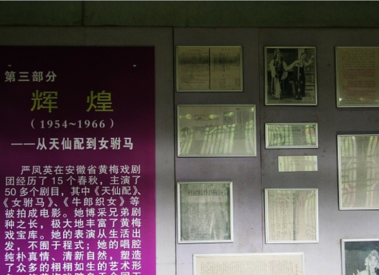那是1947年的10月份,嚴鳳英當年只有17歲,她那靈雀般的歌喉和輕盈舞姿吸引了秋浦兩岸的百姓,深受大伯大嬸們的喜愛。嚴鳳英是隨她的師父程積善(貴池晏塘人)來到秋浦的,當時搭班唱戲的還有銅陵的桂月娥、桂天賜,殷匯的宋再春、洪連梓等老藝人。先在高坦一大地主的后花園搭臺唱,后在灌口祠堂里唱,據(jù)說在唱《槐蔭別》時,嚴鳳英來了例假,被廣大的秋浦觀眾諒解后,又深為沒有看到嚴鳳英“別夫上天”的精彩表演而惋惜。最后在殷匯老街蘇家當鋪大屋唱,據(jù)說當時票價僅為三角一張(舊幣)。嚴鳳英在秋浦河兩岸前后共唱了三個月,演出的大戲有《小辭店》、《槐蔭別》、《珍珠塔》、《二龍山》、《山伯訪友》等,小戲有《蘭橋汲水》、《春香鬧學》、《送香茶》、《西樓會》、《打豬草》、《游春》等,如陣陣山野吹來的風,帶著泥土香,陶醉了秋浦兩岸的觀眾。嚴鳳英不僅藝高,人也好,肯結(jié)人緣,在秋浦唱戲時,每到一處,還和房東結(jié)了干媽干嬸。據(jù)現(xiàn)在還健在的八旬老人韓發(fā)祥回憶,嚴鳳英在殷匯唱戲時,恰逢他結(jié)婚,新婚之夜,嚴鳳英還和當?shù)匦〗忝脗円积R鬧新房,大伯、大嬸們親切地喊她“小嚴”或“紅六”,她口口聲聲答應(yīng)得親嫡嫡的像親生女兒一樣。