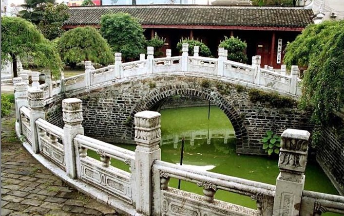 向前十步臨半月形泮池,池上有磚石拱橋,池橋皆以漢白玉石雕欄桿護(hù)配。池中碧水漾漾,金鯉嬉戲,甚是賞心悅目。傳聞明清季桐城如“天啟六君子”之一的左光斗、“百科全書式”大哲學(xué)家方以智、“父子雙宰相”張英、張廷玉以 “桐城派”鼻祖戴名世、方苞、劉大魁、姚鼐等到近千們名臣碩儒,于成名前均從橋上步入大成殿祭孔,以到金榜題名,幫譽(yù)“泮橋”為“狀元橋”,迄今人們?nèi)砸暤撬箻驗榧槿缫庵畼肥隆?/p>