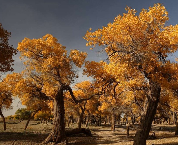 內(nèi)蒙古阿拉善盟的額濟(jì)納旗,現(xiàn)有天然胡楊林45萬(wàn)畝,是世界僅存的三大胡楊林之一,是國(guó)家自然保護(hù)區(qū)和國(guó)家森林公園。胡楊林是一個(gè)古老的樹(shù)種,被譽(yù)為“植物活化石”,有“生一千年不死,死一千年不倒,倒一千年不朽”的美譽(yù)。胡楊,又名“梧桐”,為古地中海殘遺物種,屬落葉喬木,蒙古語(yǔ)稱為“陶來(lái)”。胡楊木質(zhì)纖細(xì)柔軟,樹(shù)葉闊大清香,耐旱,生命力頑強(qiáng),是自然界稀有的樹(shù)種之一。金秋十月,額濟(jì)納是一個(gè)童話般的世界。胡楊金葉掛滿枝頭,細(xì)細(xì)看來(lái),在樹(shù)枝間竟尋不到一片異色葉子,密密匝匝,金光燦爛,至純至美;遠(yuǎn)遠(yuǎn)望去,一片片金色的胡楊把大漠裝點(diǎn)得如詩(shī)如畫,匯集成金色的海洋,吸引著大批國(guó)內(nèi)外賓客到此旅游、采風(fēng)、攝影。