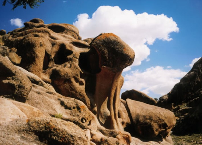 觀山猶海,哈不茨蓋怪石林(神石溝)一群率真又爽快的朋友相邀,一個(gè)富于蠱惑而神奇的召喚,一個(gè)有關(guān)山石鬼魅空靈的話題,一個(gè)久遠(yuǎn)的神往,于是,在陣雨迷離的清晨,我們結(jié)伴向著諾爾公“神石溝”出發(fā)了。 一路,漠原底色的焦黃在濃重陰云的籠罩下,淺淺雨韻的滋潤里,陡然生出一些新綠的況味。這時(shí)一個(gè)關(guān)于生命的感悟,關(guān)于自然與人的和諧審美,沿著那條鋪向遠(yuǎn)天緞帶般的路面。