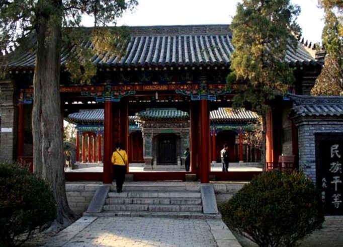 二門是單檐硬山式建筑,面闊三間,建筑面積四十五平方米。中柱五十多公分,六扇朱漆大門,檐頭雕刻伊斯蘭教經(jīng)文和圖案,工藝精湛。門內(nèi)南北兩扇墻上,鑲有四塊石碑,記述該寺歷史修二門記和禮拜時(shí)辰。三個(gè)大門上面均有匾額,正中是明成化丙戌科進(jìn)士劉瓚題字“開天正教”; 版權(quán)所有山東聊城聊之旅國(guó)際旅行社有限公司,轉(zhuǎn)載必究!右為清代鎮(zhèn)守山東登州等地的總兵官軍提督密勇巴圖魯馬建紀(jì)題字“默德真?zhèn)?rdquo;,左為清康熙二十三年掌教趙璜、張養(yǎng)心、劉翰美題字“瞻天仰圣”。現(xiàn)存二門為乾隆二十年重修。