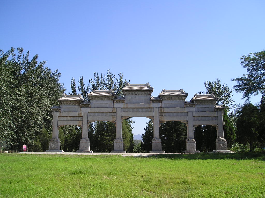 大紅門 坐落于陵區(qū)的正南面,門分三洞,又名大宮門,為陵園的正門。大門兩旁原各豎一通石碑,上刻"官員人等至此下馬"字樣。凡是前來祭陵的人,都必須從此步入陵園,以顯示皇陵的無上尊嚴。大門兩側(cè)原設(shè)有兩個角門,并連接著長達80華里的紅色圍墻。在蜿蜒連綿的圍墻中,另設(shè)有一座小紅門和十個出入口,均派有重兵駐守,是百姓不可接近的禁地。現(xiàn)在這些圍墻都早已坍塌,有些殘跡尚依稀可辨。
