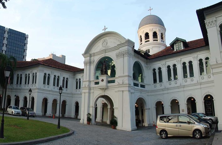 新加坡美術(shù)館坐落在新加坡最早的天主教學(xué)校圣約瑟書院舊址,這組保留完整的古希臘修道院式建筑,在新加坡十分罕見,中央建筑有兩個(gè)特征,一是成為勿拉士巴沙路象征的“三公仔”銀色塑像(中間的塑像就是基督教會學(xué)校修士學(xué)院的發(fā)起人圣約翰),二是它的銀色圓形頂樓,圓頂上還有一個(gè)十字架。