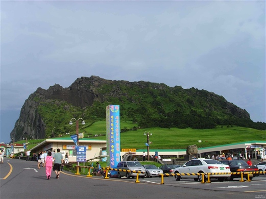 城山日出峰海拔182米,系10萬年前海底火山爆發(fā)而形成,位于濟(jì)州島東端(33°27′北,126°56′東),是一塊高聳的巨巖,其頂部有巨大的火山口。