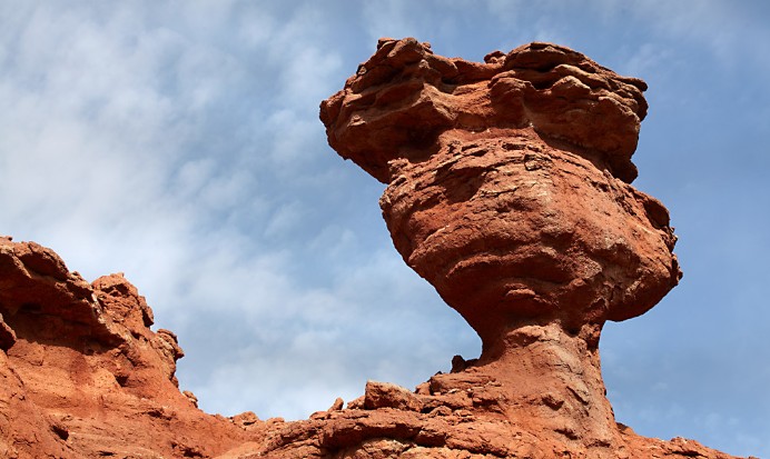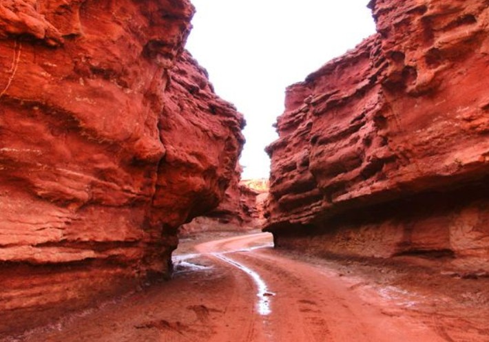 峽谷由深紅色的沙石構(gòu)成,全長5公里,在藍(lán)天、白云的襯托下,瑰麗無比,氣勢恢弘。峽谷經(jīng)歷萬年的風(fēng)剝雨蝕,洪水沖刷,而今滄桑壯美。置身其間,峰回路轉(zhuǎn),一步一景,十步不同天,仿佛步入夢(mèng)幻世界。峽谷中有一塊紅色巨石,看其普通,但其白色的沙紋竟然驚現(xiàn)出蒙文“阿拉善”三個(gè)字,令人驚奇。