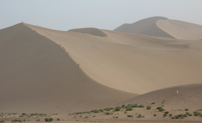 由于山勢陡峭,攀登只能緩緩而上。下山時,沙粒會隨人流動,發(fā)出管弦鼓樂般的隆隆聲響,真是扣人心弦。