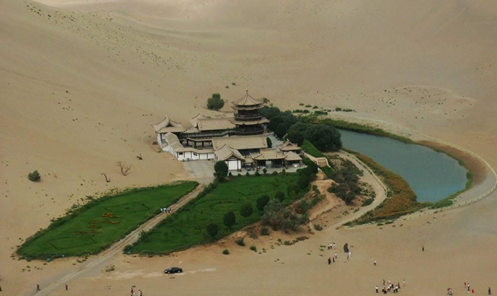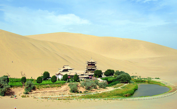 五十年代測量,月牙泉東西長218米,中斷最寬處54米,平均水深5米,最深處7米余。南岸原有廟宇百余間,但十年動亂中焚毀,農(nóng)業(yè)大躍進(jìn)時(shí)又抽水灌田導(dǎo)致池面嚴(yán)重縮小。近年修復(fù)古建、掏泉疏水、治沙綠化,才有今天面貌。臺灣易經(jīng)研究專家張淵量博士1993年游河西時(shí)根據(jù)易經(jīng)、易理考證認(rèn)定月牙泉即王母娘娘蟠桃盛會之瑤池也,信否隨意。