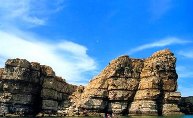 九丈崖位于北長山島的西 北角,西依珍珠門水道,北鄰國際航線長山水道,距長島縣城11公里。山崖險峻,水深流急,巖礁棋布,自然景觀獨樹一幟。崖壁綿延400余米,尤以其崖壁罕見的石質組合和高峻險要而著稱,版權所有山東聊城聊之旅國際旅行社有限公司,轉載必究!在全國眾多海蝕崖中獨占鰲頭。景區(qū)集山、海、礁、崖、洞及古跡于一體,融奇、雄、秀、美、險、神于一身,具有很高旅游和美學價值。九丈崖主要景點有:峭壁燕梭(九丈崖),高69.7米,是一綿延幾百米的巨崖,由于千萬年來風浪的侵蝕,石崖漸成了上凸下凹之勢,壁面犬牙交錯,石窟、石穴鱗次櫛比,是眾多水鳥棲息的樂園。九疊石塔,由九層節(jié)理明顯的石英巖堆成,久經海浪磨蝕雕鑿,塔崖石紋清晰,層次分明,形態(tài)別致,與九丈崖組成一對”母子崖“。水門賞古,珍珠門東側大西山腳下有塊平緩地,當?shù)厝私?rdquo;平灘“,據(jù)出土文物證明,早在四、五千年前這里就有游民季節(jié)性居住,經北京大學與長島博物館兩次挖掘,發(fā)現(xiàn)多處窯坑、灰坑和葬墓,出土了青銅戈、石刀、石錘、骨錐、骨匙和大量紅褐色、灰褐色面陶器及紋飾陶器。八仙石洞,為兩處海蝕大洞,大的深30余米,寬5米,洞頂近似拱門,傳說當年八仙曾在此聚會,洞內石英巖面凹凸錯落,玲瓏剔透。大洞毗鄰處有一小洞,寬1米多,深20余米,洞內設有石桌、石床,上開兩扇天窗,傳說是何仙姑的寢室。龍舌垂釣,因一礁石酷似龍舌伸出海面而得名。龍舌與門檻礁、鞭桿礁、蜘蛛礁、猴子礁天然形成一個良好的垂釣場,這里海水通暢,洞穴密集,是釣魚的理想之地。
