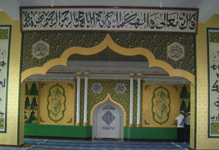 遠遠望去,清真寺的塔樓和月牙標志十分醒目。四周院墻和古式殿宇高高矗立。這座寺院離路邊不遠,卻高出路面十多米,所以必須沿著一條向北延深的小巷向高處走百十多米,方可到達山門口。這里,環(huán)境清靜,境界安謐。進入山門后,便可見院內(nèi)矗立著牌匾。再往里走,就可見到清真寺大殿。
