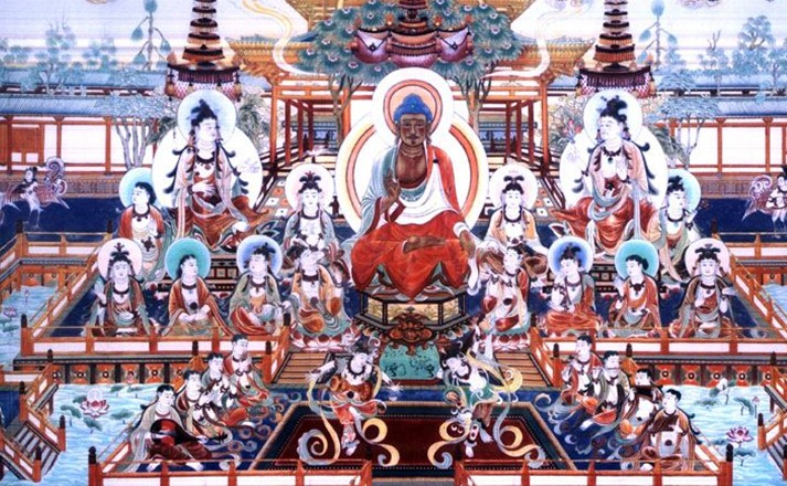 7窟前室東西壁南側(cè)繪兩幅《接引佛》。正中兩幅各4.5平方米的《說(shuō)法圖》十分復(fù)雜,天上畫(huà)日月、翼人,靈山雷音寺中佛祖高坐蓮臺(tái)說(shuō)法,左右兩側(cè)長(zhǎng)廊下站立眾弟子,兩排使樂(lè)、天人奏樂(lè),樂(lè)器有長(zhǎng)蕭、排蕭、長(zhǎng)笛、古箏、胡琴、銅磐、鐃鈸、云鑼、手鼓、大鼓等,是研究民族樂(lè)器發(fā)展歷史的重要資料。佛蓮臺(tái)前八德池中蓮花盛開(kāi),小樓內(nèi)僧人手扶橫木在撞鐘。人物栩栩如生,多達(dá)84身。圖中的大雄寶殿、亭臺(tái)樓閣結(jié)構(gòu)復(fù)雜,雄偉壯觀,是研究西夏民族建筑藝術(shù)風(fēng)格的珍貴資料。