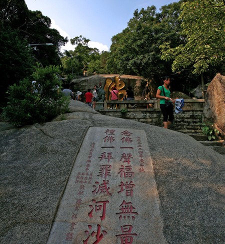 南普陀寺的殿堂、樓院、門廊等石柱上,均鐫有出自文人高士撰書的楹聯(lián)。聯(lián)文中或托景物以抒懷,或寓撣機以寄悟,巧對佳聯(lián),各得其妙。還有許多古今詩人墨客留下的詩詞吟詠,其中有不少佳作,不僅格調(diào)清新,意境高越,還賦有時事記實的內(nèi)涵,令后人在吟味中獲得史疑佐證的契機。如宋人尉滕翔在詠無盡巖的詩句中,如實地反映了當(dāng)時無盡巖下還是波浪翻滾的大海,以及山中野寺荒寂的情景,反證了所謂鷺島全面開發(fā)前的中唐,即有人獻地五十余畝以建昔照寺殿堂的誤傳。又如晚明與重興普照寺詩僧黨光和尚同時的鷺島名士池顯方,在題《五老山》詩的起句中,即以“十年古剎幾殘灰,重見天花散講臺” ,點出覺光大師重建普照寺的史實。