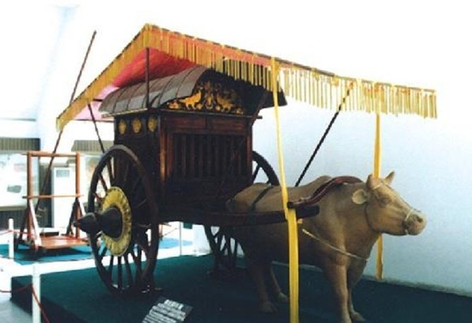 走進第二展廳,首先看到的是按照臨淄田齊王陵戰(zhàn)國墓出土的實物資料制作的戰(zhàn)國戰(zhàn)車,具有車轅短、軌距小、輕便靈活的特點。秦車則是依據(jù)秦始皇陵2號銅車馬仿制的實用車。漢代車的代表是一輛供高級貴族所乘的安車和諸葛亮制造的木牛車,特別引人入勝。