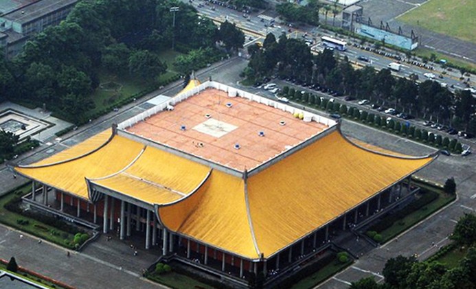 紀念館高30.4公尺,每邊長100公尺,由每邊14支灰色大柱,頂起翹角像大鵬展翼的黃色大屋頂,安靜地坐落在十萬公尺見方的平地中央,四周叢林、花草、廣場圍繞,突顯建筑物和環(huán)境的對比,引人注目,給人第一個感覺是宏偉,很有氣勢。巍峨莊嚴的建筑本體,粗獷剛強,樸素中又不失應有的細致,所以國父紀念館外觀宏偉、高雄、簡潔、明爽、有力,不但使人產(chǎn)生景仰,也令人感到力與美的結(jié)合。