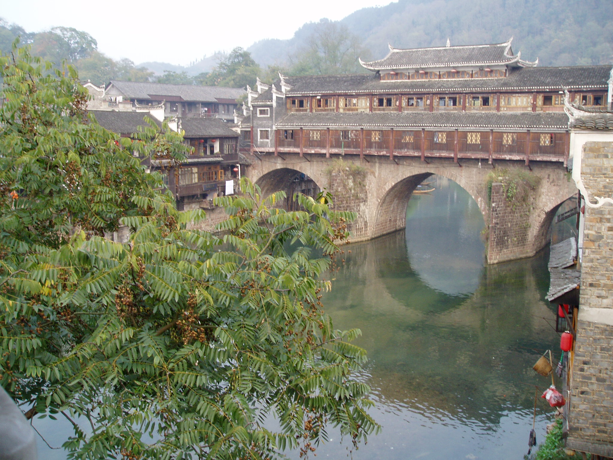 虹橋橫臥于沱江之上,風雨樓以它的壯觀和俊美拔然而起,這其實就是成了一道重疊的風景,這道風景,由下而上、由古而今穿越著六百多年的歷史。 這座橋始建于明洪武初年,頗信風水的鳳凰人都說,這座橋斬斷的是一條龍頸,令一條巨龍身首異處。怪只怪那位和尚出生的安徽小子朱元璋,聽信一位從昆侖山開始追索一支龍脈,經(jīng)云貴高原來到五寨司城的陰陽先生的讒言,說這兒屏立南郊氣勢非凡的南華山和與之一脈相承一頭扎入沱江的奇峰,就是他要尋找的龍頭。并由此推斷出總有一天這地方會有人出來問鼎中原,真命天子將出。那位朱皇帝豈能允許邊遠的鳳凰有他潛在的對頭于是朱筆一勾,龍頸被斬,鳳凰風水遭毀滅性破壞,鳳凰再也出不來皇帝了。