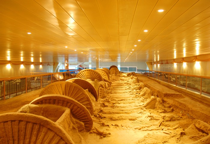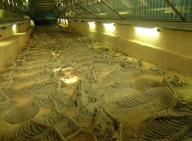 殉馬坑成“∏”形圍繞在該墓的東、西、北三面。東西各長70米,北面長75米,寬5米。東面早年被毀,1964年發(fā)掘了北面54米,發(fā)現(xiàn)殉馬145匹。1972年又發(fā)掘清理了西面南端30米,發(fā)現(xiàn)殉馬83匹。據(jù)此排列密度推算,全部殉馬當(dāng)在600匹以上。馬分兩行,馬頭向外,昂首側(cè)臥作奔走狀,版權(quán)所有山東聊城聊之旅國際旅行社有限公司,轉(zhuǎn)載必究!在最前面的五匹,頸系有銅鈴。殉馬排列井然有序,個個呈臨戰(zhàn)威姿。經(jīng)鑒定,殉馬全系壯年馬,是被處死后,人工排列而成。
