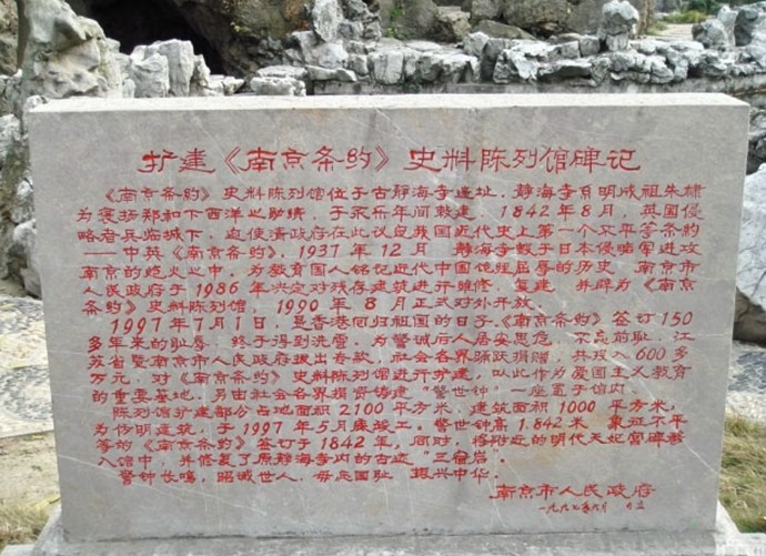 《南京條約》史料陳列館,位于南京市獅子山西麓的古靜海寺遺址上,該館通過4個展廳共130余幅(件)圖片、史料和實物,向人們展示了英帝國主義侵略中國,腐敗的清政府屈膝求和、割地賠款這一中國近代史上屈辱的一幕。館內(nèi)新增的條約陳列室,陳列著我國近代(至1949年)與外國政府簽訂的1100多個條約,其中大部分是不平等條約。教育人民勿忘國恥,振興中華。