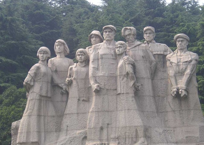 雨花臺陵園大門由花崗石砌成,高11.7 米。大門內(nèi)三面環(huán)山的廣場上聳立著一座烈士群雕,雕像高10.3米、寬14.2米,由179塊花崗石拼裝而成,是我國目前最大的花崗石群雕。雕像采用了上實下虛的手法,著重刻劃了烈士的面部神態(tài)。兩側(cè)的環(huán)陵大道可直達雨花臺主峰,主峰上矗立著一塊4.23 米高的石碑,碑身正面鐫刻著鄧小平親筆題寫的"革命烈士紀念碑"七個金字,背面刻著紀念碑文。碑前還豎有一座高5.5米的烈士青銅塑像。在紀念碑南邊的山崗上還有一座呈"U "字型,頗具民族風格的花崗巖結(jié)構(gòu)的大型建筑--"革命烈士紀念館"。館長94米、寬49米,主堡高26米,建筑面積5900平方米,館內(nèi)陳列著烈士們的遺像、遺書和遺物等。