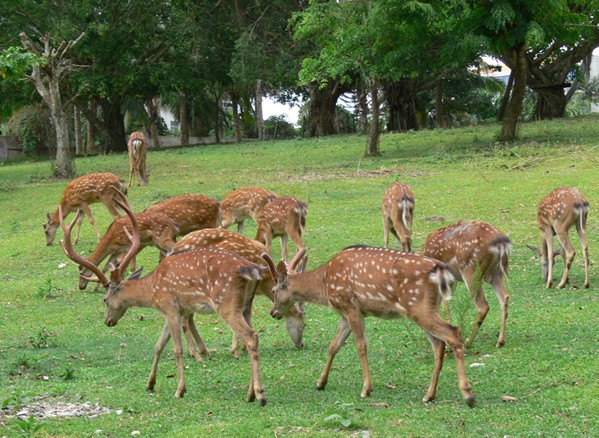 該場(chǎng)占地380多畝,60年代建成,至今已有700多只坡鹿、水鹿、馬鹿、梅花鹿、糜鹿、黃鹿嬉戲在椰林搖翠、芳草如茵的樂(lè)土上。這里,美麗的湖水,綠色的原野,設(shè)計(jì)奇妙的建筑,加上已經(jīng)馴化、可人心意的鹿群,構(gòu)成美妙有趣的童話世界。在鹿場(chǎng),你可購(gòu)一些紅薯片喂鹿逗趣,還可以摟鹿親親熱熱拍一張溫情脈脈的合影,讓你的朋友吃上半兩老陳醋。