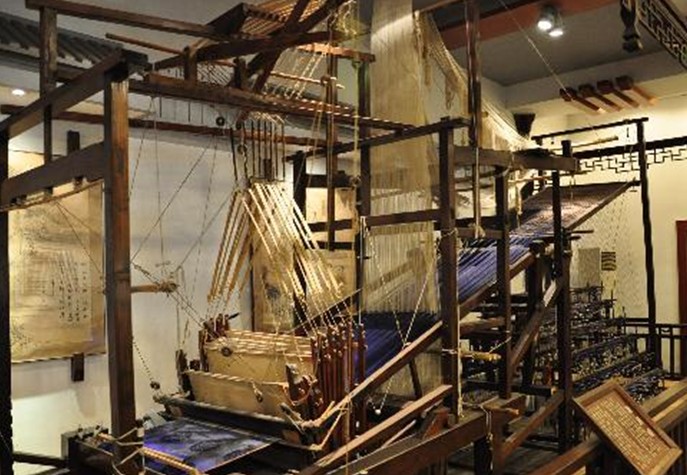 沿絲路右側(cè),一組沙漠駝隊的浮雕,形象生動,古樸渾厚,與半墻有機(jī)結(jié)合,顯示了漢唐以來絲綢之路的風(fēng)光特色。“古代館”的絲綢陳列,以其珍貴的絲綢文物及模型、圖片,展示了新石器時代晚期絲綢的起源,直到明清時期絲綢生產(chǎn)的沿革,它是一部濃縮了的中國古代絲綢史。絲綢離不開蠶桑,“蠶桑居”是根據(jù)近代農(nóng)家養(yǎng)蠶載桑的真實情景和桑園再造。跨進(jìn)“織造坊”,又是另一番景象,在這里可以見到各種類型的古代織機(jī)和傳統(tǒng)工藝的手工操作表演,猶如身臨明清時期蘇州絲綢業(yè)“東北半城,萬戶機(jī)聲”的繁榮境地。織女們身著古裝作現(xiàn)場表演。天鵝絨織機(jī)、漳緞織機(jī)、云錦織機(jī)、腳踏繅絲機(jī)、纟革絲機(jī),都在進(jìn)行運(yùn)轉(zhuǎn)操作,古代云錦、彩經(jīng)絨、纟革絲等著名絲綢品種的織造過程,在這里都得到充分演示。有一種工藝獨(dú)具特色,讓人看后舍不得離開,一塊巨大的石元寶下的凹槽里,放著纏有絲織品的木棍,一位藝人將兩腳踏在石元寶下的兩個突出部,然后晃動石元寶,通過碾壓,使絲綢變得柔軟平挺。光澤可鑒。這就是江南絲織工藝一絕的絲綢砑光處理。