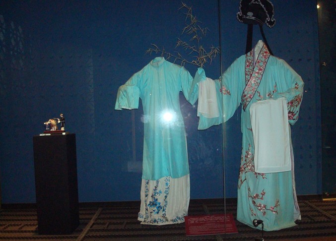天井里兩側(cè)鋪的是青磚,中間是石板,往里走,應(yīng)該是博物館里最大的展廳,在我踏進(jìn)門前,聞到了茉莉花的香味,版權(quán)所有山東聊城聊之旅國(guó)際旅行社有限公司,轉(zhuǎn)載必究!掃目看,原來(lái)這個(gè)大展廳兩側(cè)都放著茉莉花,裝在盆里。抬頭仰目,同樣這里也有對(duì)聯(lián),橫批“吳歙萃雅”(注:此歙字像歙非歙,電腦里找不見(jiàn)),左梁“圣旦凈末丑塑就奸佞賢禎相”,右梁“宮尚角徵羽唱徹悲歡離合情”。展廳門前牌子上寫的是“昆劇江湖角色行當(dāng)行頭展”,進(jìn)到里面,感覺(jué)就是廟堂里的大雄寶殿,很寬敞,不過(guò)兩邊不是羅漢像了,都是些行頭之類的,比如唐明皇與楊貴妃的黃色服飾;大廳中間當(dāng)然也不會(huì)是三尊佛,而是一個(gè)小型的室內(nèi)戲臺(tái),戲臺(tái)后兩側(cè)卷簾上寫著“出將”和“入相”。
