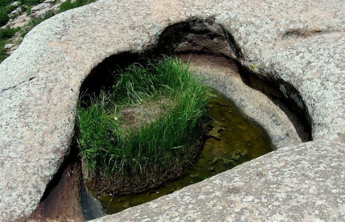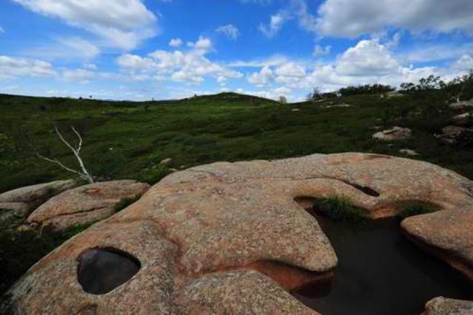 青山自然保護(hù)區(qū)位于海拔1574米的青山山體上,在山頂頂峰分布著各種各樣的冰臼,其平面上多數(shù)呈圓形、近圓形、橢圓形和不規(guī)則的形狀。有的象葫蘆,有的象梅花,有的象瓜子。一般冰臼口稍小,中下部較大,底多較平或呈鍋底微凹。形體“似臼”、“似盤”、“似盆”、“似匙”等,可以說應(yīng)有盡有。其中較深的冰臼多呈口小、肚大和底平特征。口部上緣帶有缺口(或開口),缺口有大有小,有深有淺。一般臼口寬約0.3~2米,深0.1~2米左右。最大的直徑達(dá)10.5米,深4.5米;最小的只有幾公分,似一般鈕扣大小。據(jù)調(diào)查統(tǒng)計,在方圓不到2平方公里的范圍內(nèi),就有大小不一的冰臼1000多個。有的冰臼光潔如洗,無任何殘留物和充填物,但很多冰臼中,都填滿風(fēng)塵黃土物質(zhì),已長滿花、草或喬木、灌木,形成大小不同的“天然盆景”,置于堅硬平坦的花崗巖山脊上,十分壯觀,給人極大的神奇感和奧秘感。
