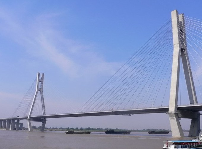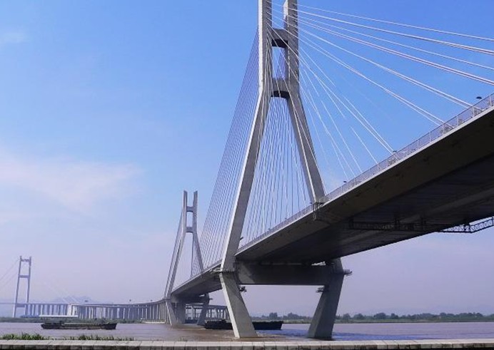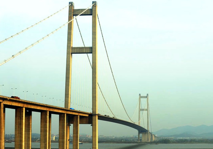 位于江蘇省鎮(zhèn)江、揚州兩市西側(cè),為目前我國第一大跨徑的組合型橋梁,其建設(shè)過程中攻克多項世界性技術(shù)難題,當時是國內(nèi)工程規(guī)模最大、建設(shè)標準最高、投資最大、技術(shù)最復(fù)雜、技術(shù)含量最高的現(xiàn)代化特大型橋梁工程,是我國第一座剛?cè)嵯酀慕M合型橋梁。