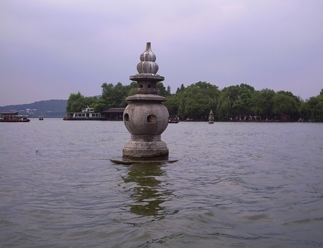 據(jù)說,三潭印月的三座石塔,就是香爐的三只腳。又因為香爐里的一爐香灰倒翻在西湖里,從此,西湖泥都成了香灰泥。