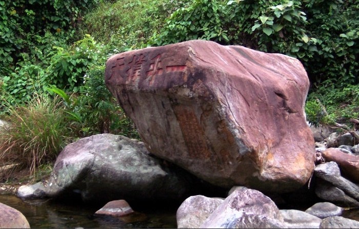 位于海南瓊中縣上安鄉(xiāng)仕階村,在五指山與湯匙嶺之間的東邊大巖石上,距五指山僅5公里,距上安鄉(xiāng)13公里,離縣城營根39公里。一片清代光緒十三年春砌志,是清朝將領馮子才及幕僚刻石,其中,“手辟南荒”、“一手撐天”、“百越鎖鑰”、“巨手擎天”等摩崖石刻群。字大如斗,筆法渾厚,氣勢磅礴。明代大學士邱浚的詠五指山詩曰“五峰如指翠相連,撐起炎荒半壁天。夜盥銀河摘星斗,朝探碧落弄云煙。雨余玉筍空中現(xiàn),月出明珠掌上懸。豈是巨靈伸一臂,遙從海外數(shù)中原”。