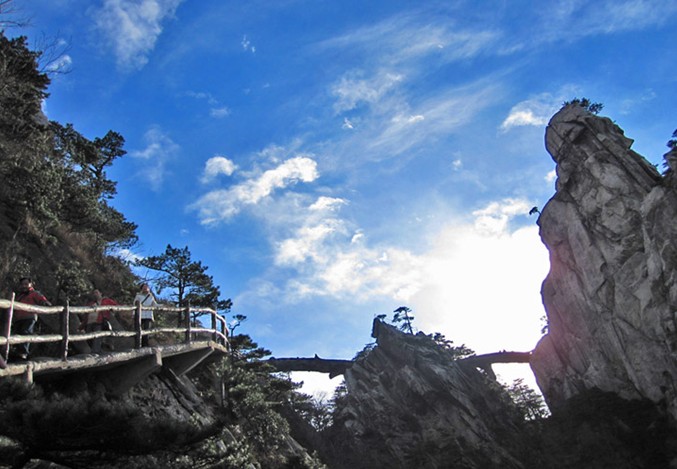 天堂寨頂峰天堂頂,海拔1729、13米,素有中原第一峰之美稱。這里,北望中原,南眺荊楚,巍巍群山盡收眼底,茫茫天地網(wǎng)絡(luò)其中,氣勢磅礴,景色壯觀。環(huán)顧四周,筆架山雄姿若隱若現(xiàn),九資河倩景如玉帶飄舞。清風吹過,足下林海頓時泛起層層綠波,起伏跌宕,似有排山倒海之勢,響起陣陣濤聲,久久回蕩,如鼓角相聞。這里還是觀高山日出的理想佳地。晨曦初露,天宇朦朧,一輪紅日噴薄而出,霎時萬道霞光籠罩四周,萬物復(fù)蘇,百鳥齊鳴,好一幅高山日出的壯麗畫面。