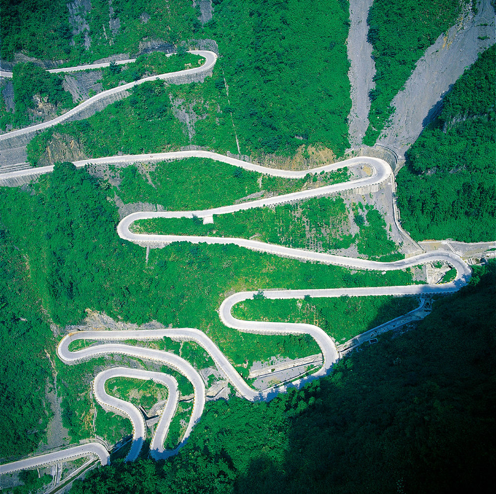 天門(mén)洞以其接地通天的態(tài)勢(shì),成為人們心中通天的門(mén)戶(hù),而通往天門(mén)洞的盤(pán)山公路也因此被稱(chēng)為“通天大道”。更為神奇的是,在公路竣工的時(shí)候,人們驚奇地發(fā)現(xiàn),這條順山勢(shì)修建的通天大道剛好九十九個(gè)彎,暗合了“天有九重,云有九霄”之意。 通天大道以進(jìn)山時(shí)的標(biāo)志門(mén)為起點(diǎn),一直通達(dá)天門(mén)洞腳下,全長(zhǎng) 10.77 公里 ,但就在這么短的距離里,它的海拔卻從 200 米 急劇提升到了 1300 米,大道兩側(cè)絕壁千仞,空谷幽深,180 度的急彎此消而彼,層層疊起,“ 堪稱(chēng)天下第一公路奇觀 ”。中國(guó)書(shū)法協(xié)會(huì)常務(wù)副會(huì)長(zhǎng)沈鵬先生走過(guò)通天大道后欣然為其題字“曲道通天”,字體遒勁挺拔,與通天大道的奇絕天下相融為一體。通天大道于 1998 年開(kāi)始修建,因天門(mén)山獨(dú)特的地質(zhì)和氣候所局限,至 2005年全面貫通,歷時(shí)八年,共耗資 1 億元人民幣。整個(gè)工程充滿(mǎn)著艱辛卓絕,它凝聚著全體施工人員的智慧和心血,其勢(shì)驚險(xiǎn)奇絕,蕩氣回腸,以蜿蜒迂回穿行于山體絕壁之天險(xiǎn)而成為天下第一公路奇觀。