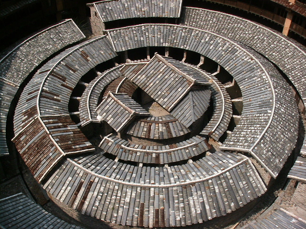 圓樓是當?shù)赝翗侨褐凶罹咛厣慕ㄖ话闼砸粋€圓心出發(fā),依不同的半徑,一層層向外展開,如同湖中的水波,環(huán)環(huán)相套,非常壯觀。其最中心處為家族祠院,向外依次為祖堂,圍廊,最外一環(huán)住人。整個土樓房間大小一致,面積約十平方米左右,使用共同的樓梯,各家風乎無秘密可言。