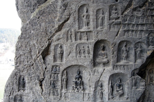 奉先寺的九軀大像的背后有很多長(zhǎng)方形的小龕,這是大約在宋、金時(shí)代,人們?yōu)榱吮Wo(hù)大像龕,依龕修建了木結(jié)構(gòu)屋檐式建筑,這些建筑影響了佛像的通風(fēng),加速了佛像的風(fēng)化,因而后來(lái)被拆除。