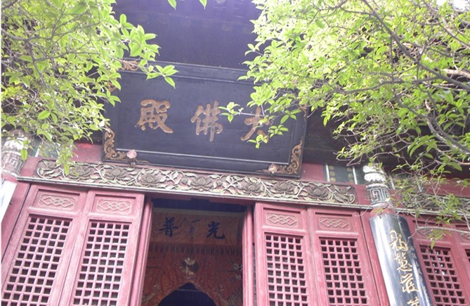 大佛殿之后,是一座懸山式建筑“大雄殿”。它長(zhǎng)22.8米,寬14.2米。殿前有一月臺(tái),是寺院內(nèi)最大的殿宇。由歇山頂改為懸山頂,面積有所縮小。殿內(nèi)貼金雕花的大佛龕內(nèi)塑的是三世佛:中為婆娑世界的釋迦牟尼佛,左為東方凈琉璃世界的藥師佛,右為西方極樂(lè)世界的阿彌陀佛。三尊佛像前,站著韋馱、韋力兩位護(hù)法天將的塑像,執(zhí)持法器。兩側(cè)排列十八尊神態(tài)各異、眉目俊朗的羅漢塑像。這十八羅漢都是用漆、麻、絲、綢在泥胎上層層裱裹,然后揭出泥胎,制成塑像,這種“脫胎漆”工藝叫夾苧干漆工藝,在國(guó)內(nèi)是獨(dú)一無(wú)二的,乃寺中塑像之精品,每座佛都是空心的,一只手即可托起。背后殿壁上還排列整齊地刻鏤著五千余尊微型佛像。大雄殿后有接引殿,為一般寺院所罕見(jiàn)。長(zhǎng)14米,進(jìn)深10.7米。為雙層殿基,是寺內(nèi)最小建筑。殿內(nèi)供西方三圣。中為阿彌陀佛立像,左邊為持凈瓶的觀世音菩薩,右邊握摩尼寶珠的是大勢(shì)至菩薩,均為清代泥塑。
