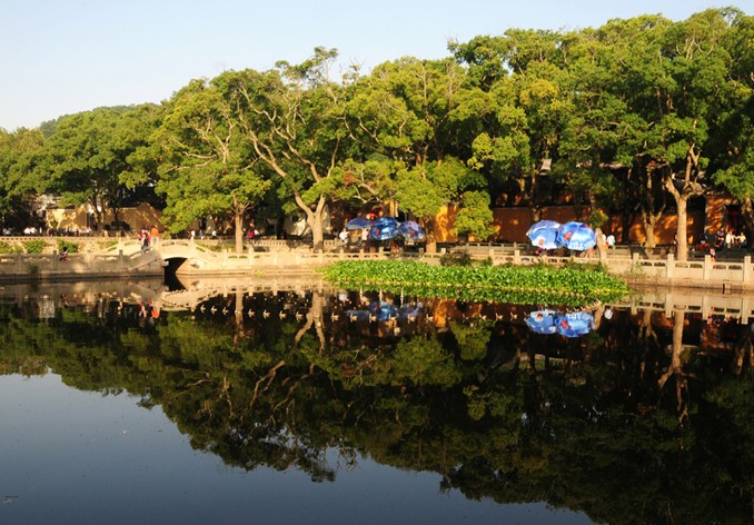 蓮花池三面環(huán)山,四周古樟參天,池水為山泉所積,清瑩如玉。每當盛夏之際,池中荷葉田田,蓮花亭亭,映襯著古樹、梵宇、拱橋、寶塔倒影,構成一幅十分美妙的圖畫。夏季月夜到此,或風靜天高,朗月映池;或清風徐徐,荷香襲人。