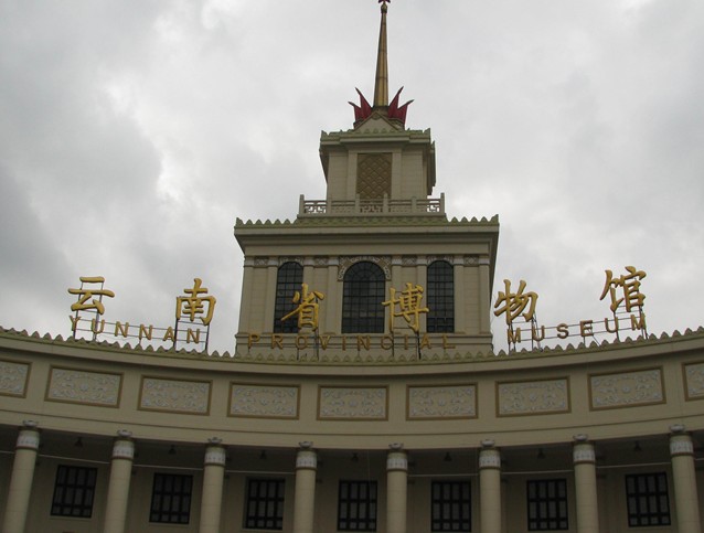云南省博物館于1964年建成使用。它是一座主樓七層,兩翼三層的寶塔式建筑,通高40余米。大樓一至三層為展廳,面積共4200平方米,前面是12根合抱粗的圓形大柱,屋頂金色剎桿燦燦,紅星閃爍,氣勢(shì)雄偉,造型別致。