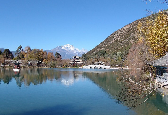 云南麗江黑龍?zhí)叮蝴惤邶執(zhí)队置袢珗@,位于城北象山腳下,從古城四方街沿經(jīng)緯縱橫的玉河溯流而上,約行一公里有一處晶瑩清澈的泉潭,即為中外聞名的黑龍?zhí)丁L端畯氖p間涌涌噴出,依山斛清泉匯成四萬(wàn)平方米潭面。四周山清水秀,柳暗花明。依山傍水造型優(yōu)美的古建筑點(diǎn)綴其間。其流韻溢彩,常引人駐足留連。